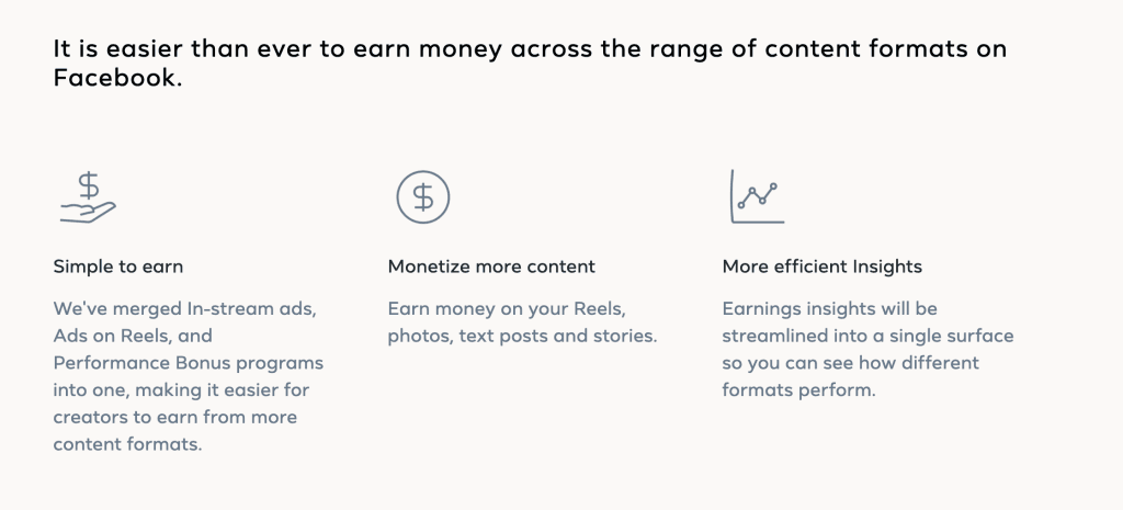 The new Facebook Content Monetization program brings everything in one single program, letting creators make money through: