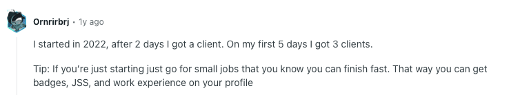 Done right, you might land that first client pretty quickly, as some users report it only took them 2 days to get their first project rolling.